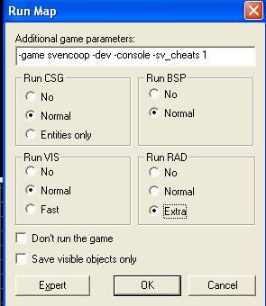 The second compile is a more thorough (although not full) compile. This is used when you want to check the read speeds (r_speeds) but don 't care about lighting. Set the BSP, CSG, and VIS to run, but also check the Full Vis box. This compile would take longer to build your map, but will have the proper VIS Matrix. Full vis can also fix some brush errors, though some can still seep through VIS.