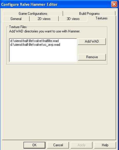 And lastly, the textures tab. Its always good, to keep the HalfLife.wad in your wad list, as this has the most useful textures, that you will use. The sc_avp.wad is a custom wad found at http: //downloads.ammahls.com /sc /maps /sc_avp_v2 /sc_avp-wad.zip , and is the wad used in the sc_avp mission set. You can also add wads from your favorite maps, or if you 're really cool, wads that you 've created on your own with Wally.